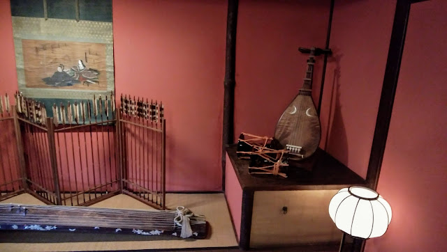 左側は、国指定重要文化財のお茶屋の建物「志摩」。公開しているので、内部を見学した。撮影はスマホのみで、荷物類はすべて預ける、建物、展示類が傷つかない配慮だ。